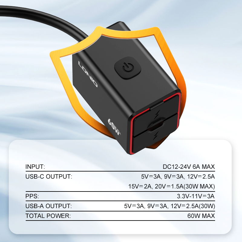 CARGADOR DE MOTO C108 60W USB C + QC3.0 + CABLE USB 30CM IPX6
